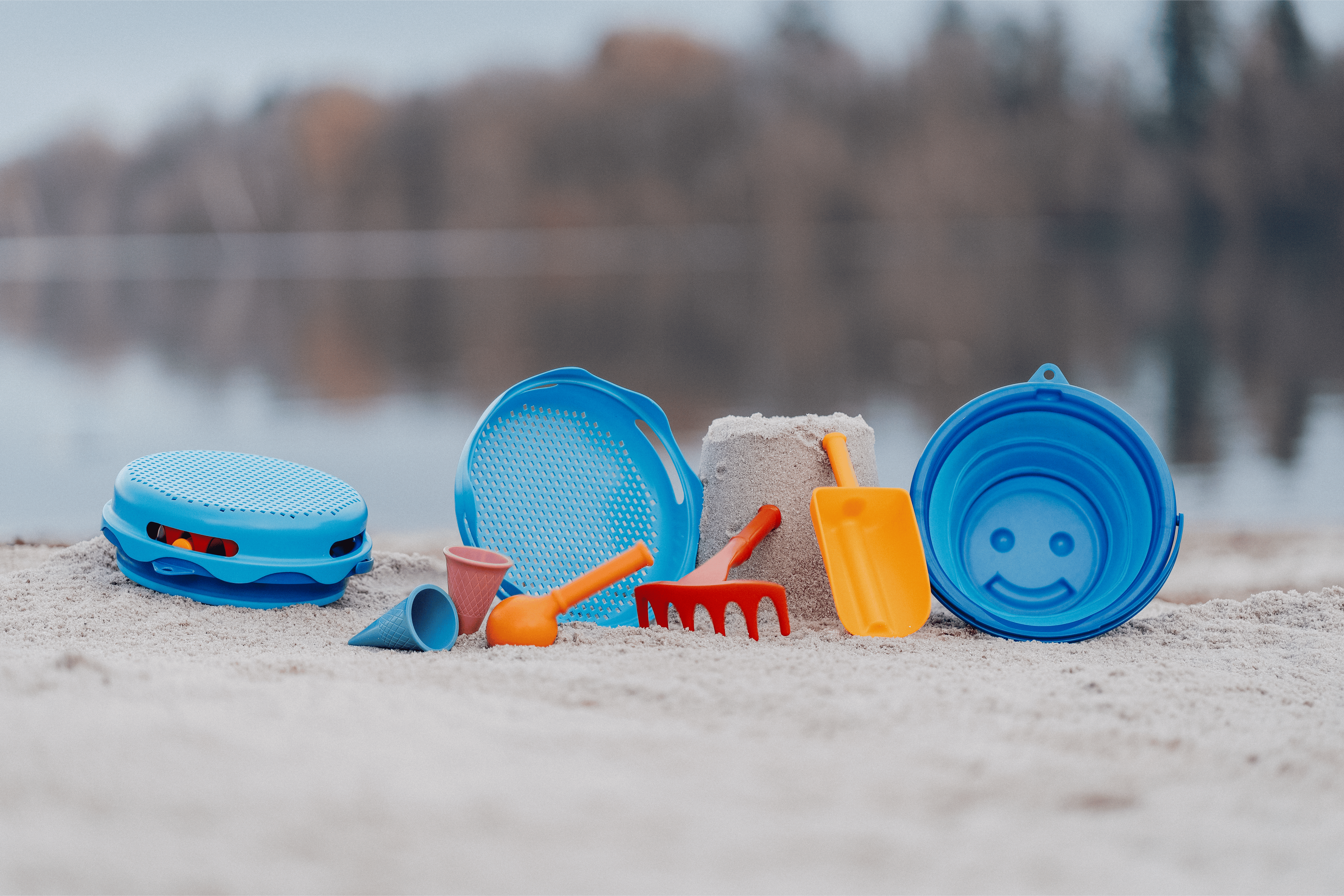 Et komplet spand-sæt i håndtaskestørrelse med udvalg af grave-, formnings-, sigte-, rive- og transportsandlegetøj.