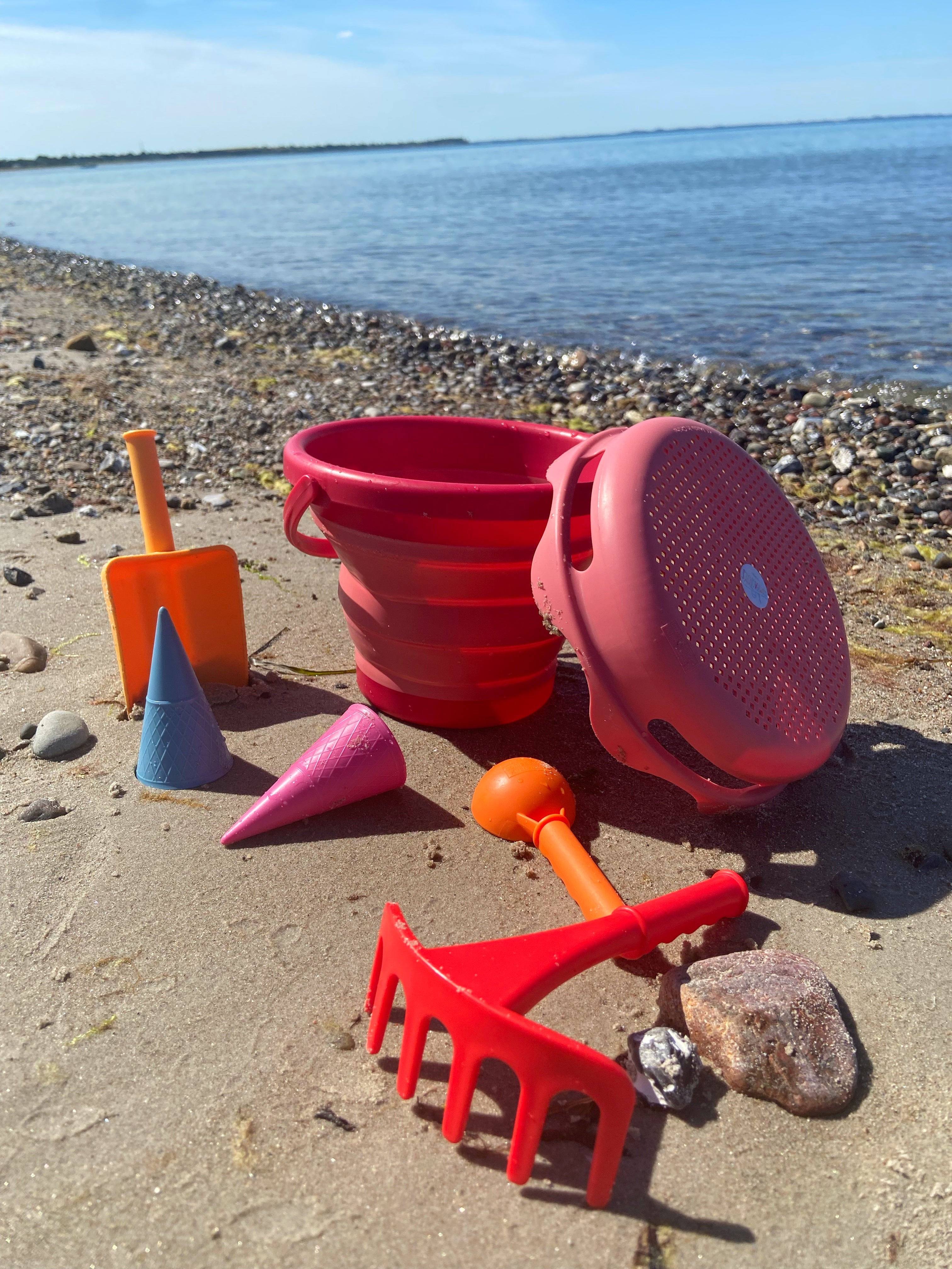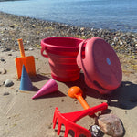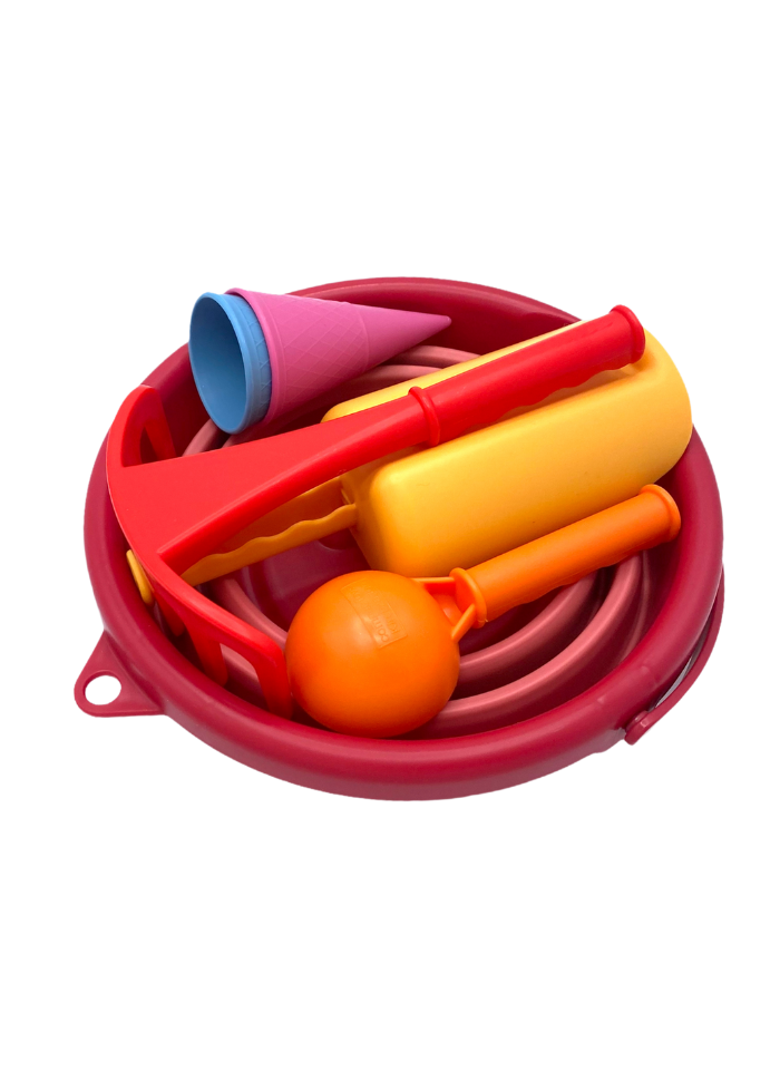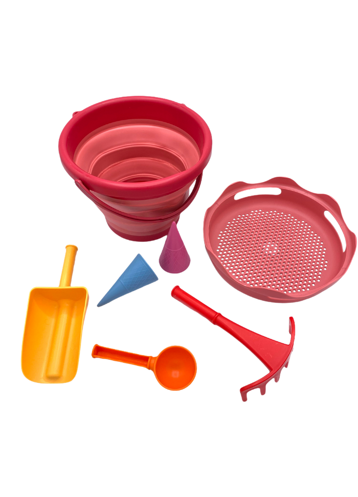 Et komplet spand-sæt i håndtaskestørrelse med udvalg af grave-, formnings-, sigte-, rive- og transportsandlegetøj.
